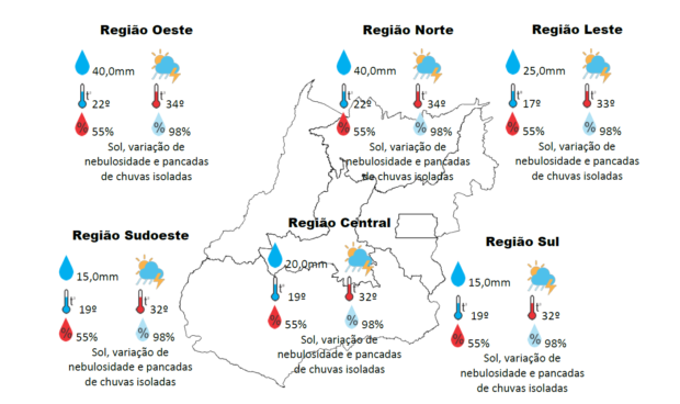 - Oeste e Norte: 40 mm de chuva, temperaturas entre 22°C e 34°C, e umidade de 55% a 98%. Espera-se sol com variação de nebulosidade e pancadas de chuva isoladas.