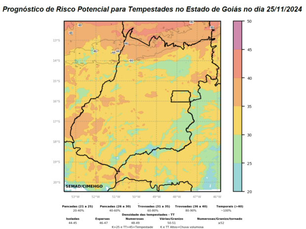 Os municípios de Alvorada do Norte, Amaralina, Buritinópolis, Damianópolis, Estrela do Norte, Mambaí, Mutunópolis, Nova Crixás, Novo Planalto, Porangatu, Posse, Santa Tereza de Goiás, São Miguel do Araguaia, Simolândia e Sítio d’Abadia estão em risco potencial para tempestades, conforme o boletim emitido pelo CIMEHGO.
