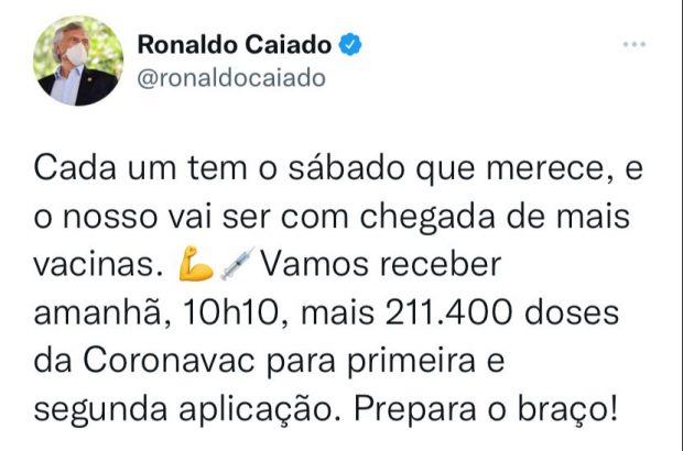 No sábado, 18, está previsto chegar em Goiás 211. 400 doses da Coronavac. O novo lote é destinado tanto quanto para primeira aplicação como para segunda.