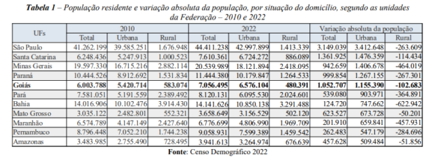 Em Goiás, esse crescimento urbano foi ainda mais evidente: de uma população total de 7.056.495 habitantes, 93,2% (6.576.104 pessoas) vivem em áreas urbanas, enquanto 6,8% (480.391 pessoas) estão em áreas rurais.