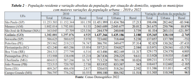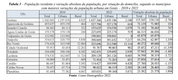 Entre os municípios, Goiânia se destacou com um acréscimo de 138.110 habitantes na área urbana, sendo a quarta maior variação entre as cidades do país. Esse aumento é atribuído tanto ao processo de urbanização das grandes cidades quanto a uma revisão metodológica do IBGE.