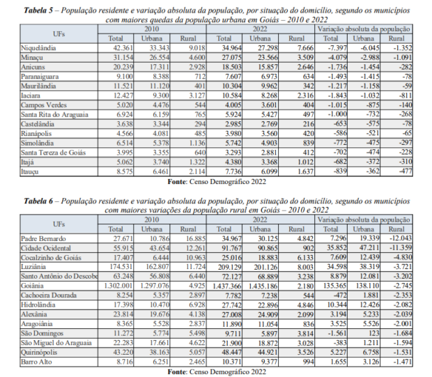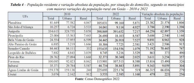 Alguns municípios como Planaltina, São João d’Aliança, Anápolis e Pirenópolis também apresentaram aumentos populacionais notáveis nas áreas rurais, enquanto outros registraram quedas entre os Censos de 2010 e 2022.