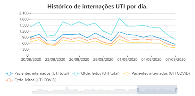 A taxa de ocupação de leitos de Unidade de Terapia Intensiva (UTI) exclusivos para pacientes com Covid-19 é 82,32%, são 419 pacientes suspeitos ou confirmados. Para enfermaria Covid-19, a taxa é de 46.78%, com 545 pacientes suspeitos ou confirmados.