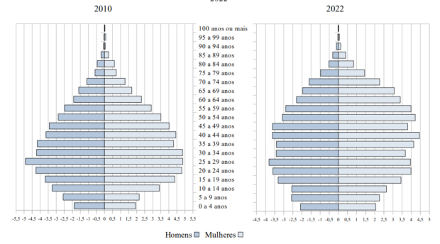 Além disso, a idade mediana aumentou de 34 anos em 2010 para 39 anos em 2022. Quanto à distribuição por sexo, houve uma redução na razão de sexo, de 89,97 em 2010 para 84,37 em 2022, refletindo uma diminuição na quantidade de homens em comparação com as mulheres. As mudanças demográficas na população indígena em Goiás são evidentes ao comparar as pirâmides etárias dos Censos Demográficos de 2010 e 2022. Enquanto houve um leve aumento na proporção de crianças com menos de 10 anos, houve quedas significativas nos grupos de 10 a 29 anos e 30 a 39 anos. Por outro lado, os principais aumentos foram observados nos grupos de 50 a 79 anos.