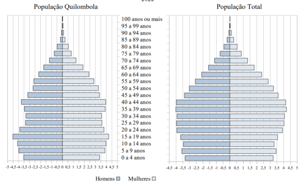 A análise do perfil das pessoas quilombolas, segundo a residência em territórios oficialmente delimitados ou não, demonstrou diferenças significativas. Em Goiás, 16,80% da população autodeclarada quilombola residiam em territórios oficialmente delimitados (5,1 mil pessoas), enquanto 83,20% residiam fora (25,3 mil pessoas). Embora em ambos a população com menos de 29 anos seja a maioria, era significativa a concentração desta faixa etária nas pessoas residindo em territórios quilombolas.