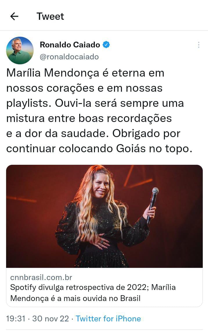 Na noite desta quarta-feira, 30, o governador Ronaldo Caiado usou o twitter para agradecer a liderança de Marília Mendonça na rede Spotify e continuar colocando o Estado de Goiás no topo.