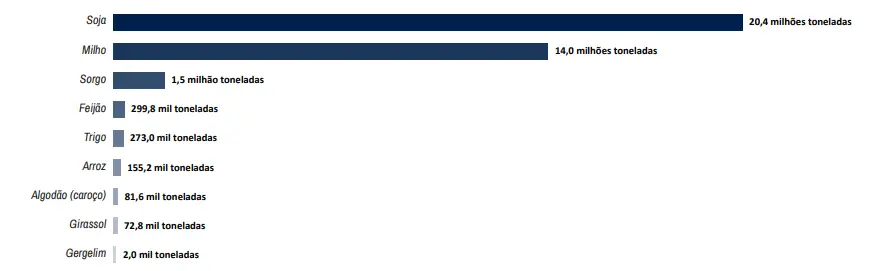 A soja e o milho seguem como os principais produtos da produção agrícola local, com 20,4 milhões e 14 milhões de toneladas, respectivamente, segundo dados mais recentes. Bem atrás aparecem o sorgo, com 1,5 milhão de toneladas, e culturas tradicionais como feijão (299,8 mil toneladas), trigo (273 mil) e arroz (155,2 mil). Já o algodão em caroço (81,6 mil toneladas), o girassol (72,8 mil) e o gergelim (2 mil) completam a lista, evidenciando a forte concentração da safra em grãos de larga escala.