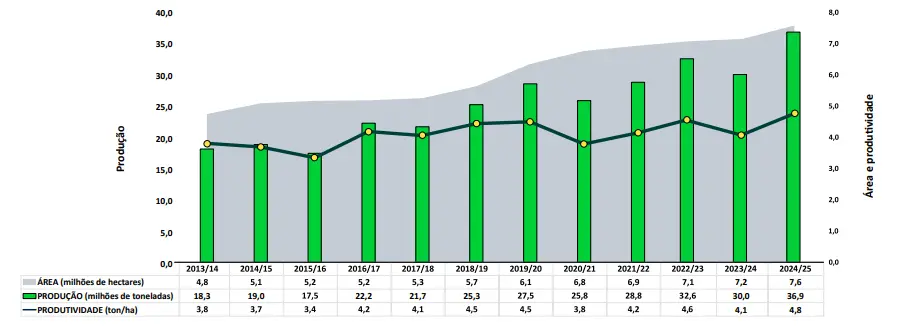 A produção de grãos atingiu novo recorde na safra 2024/25, chegando a 36,9 milhões de toneladas, quase o dobro do registrado em 2013/14, quando foram colhidas 18,3 milhões. O crescimento reflete tanto a expansão da área cultivada, que passou de 4,8 milhões para 7,6 milhões de hectares, quanto o avanço da produtividade, que alcançou 4,8 toneladas por hectare. Apesar de algumas oscilações ao longo do período, o setor mantém trajetória consistente de alta e consolida o papel do país como potência agrícola.