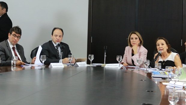 A secretária estadual de Educação, Raquel Teixeira; o presidente da Agência Goiana de Habitação (Agehab), Luiz Stival; e o secretário de Gestão e Planejamento, Joaquim Mesquita; se reuniram com prefeitos para anunciar o apoio do governo estadual na construção de Centros Municipais de Educação Infantil (CMEIs) em 39 municípios.
