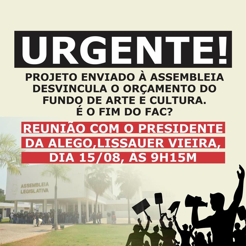 O banner a seguir foi compartilhado no grupo público do Facebook, Fundo de Arte e Cultura de Goiás, que não é oficial do FAC.