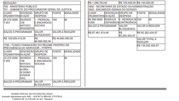 Para isso, foram retirados R$ 46.890.000,00 de encargos com inativos e pensionistas do Ministério Público, R$ 100.000,00 de despesa com inativos e pensionistas da Universidade Estadual de Goiás (UEG). Além de R$ 92.262.424,97 da reserva de contingência da Secretaria de Administração (Sead).