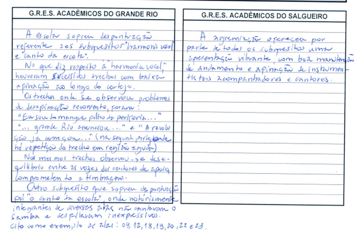 Na justificativa formal, a jurada Julia Félix destacou falhas nos subquesitos “harmonia vocal” e “canto da escola”. Segundo o texto, foram identificados “sucessivos trechos com baixa afinação ao longo do cortejo”. A avaliadora detalhou, inclusive, os momentos em que teria ocorrido desafinação recorrente, citando versos específicos do samba.
