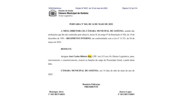 O subprocurador Herbet de Vasconcelos Barros vai assumir definitivamente o cargo de Procurador-Geral da Câmara Municipal de Goiânia. Ele ficou como procurador interino da Casa até a última quinta-feira, 15, quando o diretor legislativo José Carlos Issy assumiu o cargo de forma interina e cumulativa, conforme adiantado pela reportagem e confirmado na portaria nº 842 de 14 de maio, publicada na edição do Diário Oficial do Município (DOM) de ontem.