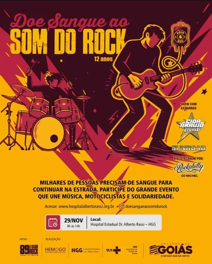 A 12ª edição do “Doe Sangue ao Som do Rock”, iniciativa do Hospital Estadual Alberto Rassi (HGG), será realizada neste sábado, 29, com a missão de reforçar os estoques de sangue justamente no período crítico de fim de ano. O evento volta ao calendário com a expectativa de superar as edições anteriores e atrair um grande número de voluntários.