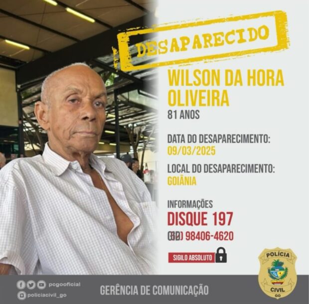 Para compartilhar informações sobre o paradeiro de Wilson, é só entrar em contato com Marcelo, filho do homem desaparecido, pelo número 62 9 9123-4213. A Polícia Civil de Goiás também recebe informações sobre o caso pelo número 197.