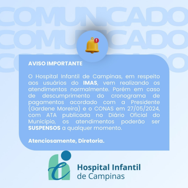 Cabe ressaltar que o novo processo de credenciamento de todos os prestadores foi aberto pelo Imas em fevereiro de 2024, e o Hospital Infantil de Campinas pediu adesão apenas no dia 20 de maio. Até o momento, o processo não foi aprovado por falta de documentação exigida no edital, tendo em vista que o hospital consta com certidão federal positiva e a mesma precisa ser regularizada para que o novo credenciamento possa ser concluído.