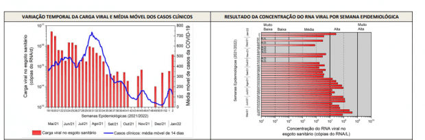 Em considerações gerais do documento, é afirmado que, a média móvel de casos clínicos reportados também vem sofrendo reduções gradativas. Porém, na última semana foi detectada concentração média de fragmentos do RNA viral no esgoto, na ordem de 105 cópias de RNA/L. “Nas semanas epidemiológicas de 30 a 49/2021, amostragens realizadas entre os dias 30 de julho e 08 de dezembro de 2021, foi detectada a presença de fragmentos do material genético do SARS-CoV-2. As concentrações detectadas variaram entre 106 e 109 cópias de RNA/L (faixas de média e alta concentração)”, aponta boletim.