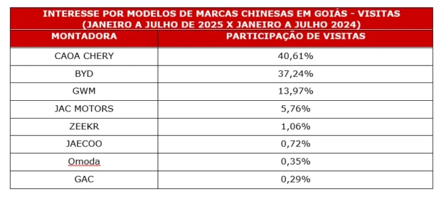 Quando considerado o total de buscas e visitas que todos os veículos dessas montadoras registraram na plataforma no estado durante o período, a CAOA Chery lidera com 40,61%, seguida por BYD (37,24%), GWM (13,97%), JAC Motors (5,76%), Zeekr (1,06%), Jaecoo (0,72%), Omoda (0,35%) e GAC (0,29%).