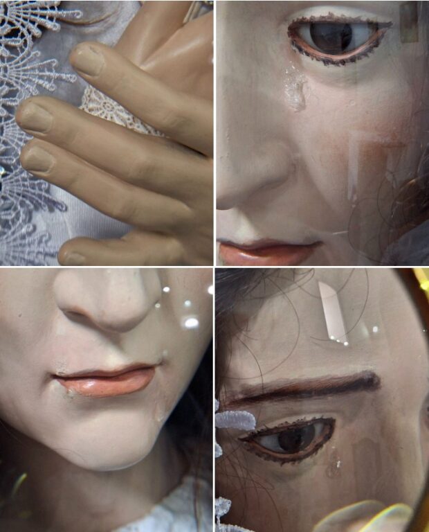 detalhe da pintura na área dos lábios; vista a partir da lupa de aumento, pintura da sobrancelha.
