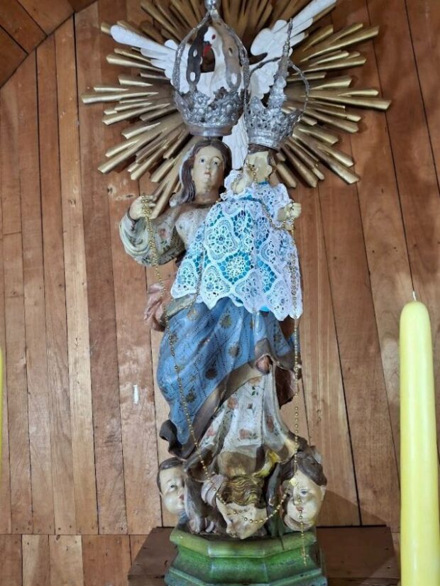 Já a imagem de Nossa Senhora do Rosário, considerada uma das mais importantes da igreja, apresenta acúmulo de sujeira, ressecamento da tinta e escurecimento de áreas que possivelmente continham dourado. A escultura perdeu alguns dedos e teve parte da coroa recomposta de forma cuidadosa, mas a pintura também foi afetada. O estado geral foi considerado precário, principalmente pela fragilidade da policromia.