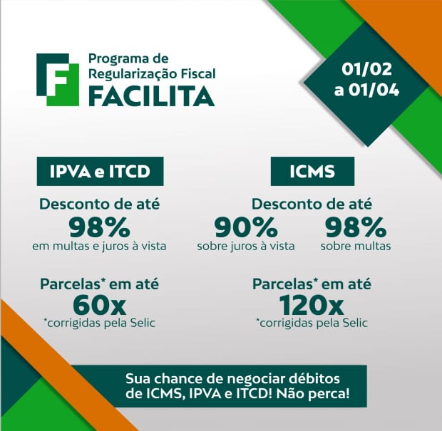 Segundo informações do Governo do Estado, O programa Facilita permite o pagamento à vista o desconto nos juros e na multa de IPVA e ITCD é de até 98%, além disso o débito poderá ser parcelado em até 60 vezes com correção pela taxa selic. “É uma grande chance para o contribuinte regularizar débitos com a receita estadual, especialmente nesse momento delicado de dificuldade causado pelos impactos econômicos da pandemia”, frisou a secretária da Economia, Cristiane Schmidt.