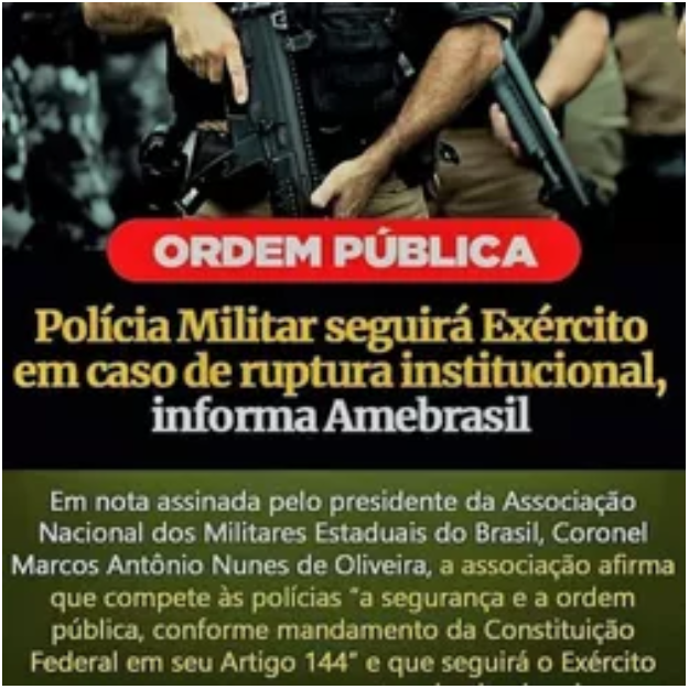 A bravata consiste em uma imagem de militares armados com um texto em que se lê a fala do coronel da PM de Brasília, que também preside a Associação dos Militares Estaduais do Brasil (Amebrasil). Na citação, Marcos Oliveira menciona o Artigo 144 da Constituição Federal. Veja a mensagem encaminhada pelo presidente da República: