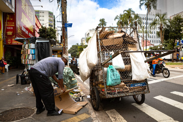 A fotografia de Guilherme Alves premiada em 3º lugar na categoria Fotojornalismo retrata um catador de reciclaveis no centro de Goiânia. Confira: