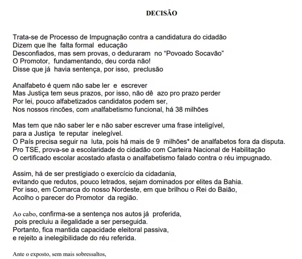 Na decisão, o juiz utilizou versos para tratar de questões sociais mais amplas, como o alto índice de analfabetismo no Brasil, estimado em mais de 11 milhões de pessoas, segundo o Censo de 2022. “O país precisa seguir na luta, pois há mais de 9 milhões de analfabetos fora da disputa”, afirmou Brandão Netto, em referência à exclusão social causada pelo analfabetismo.