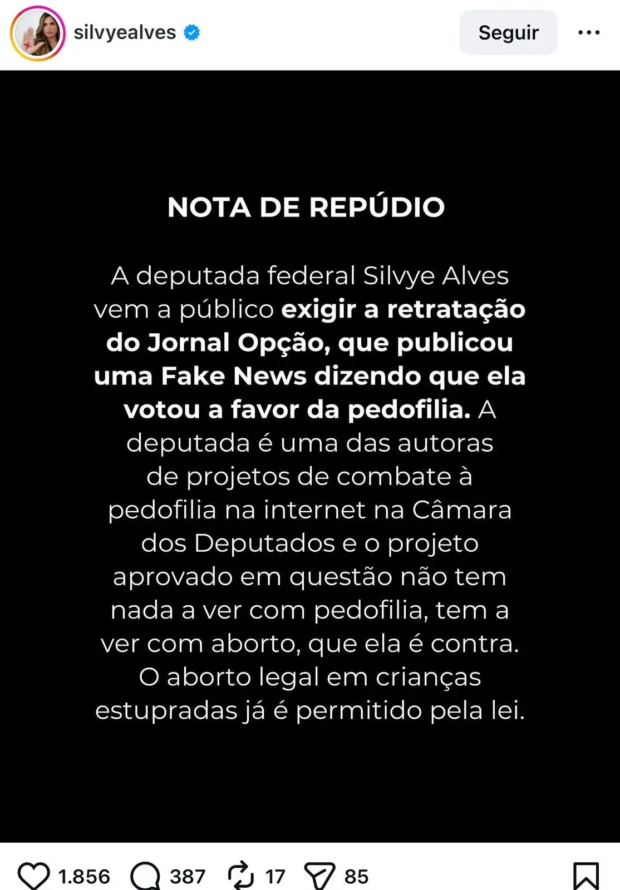 A deputada federal Silvye Alves foi condenada pela Justiça de Goiás a pagar uma indenização ao Jornal Opção. Isso aconteceu porque ela atacou o jornal nas redes sociais e disse que ele estava divulgando notícias falsas. A Justiça também viu que a deputada insinuou que o jornal recebia dinheiro para publicar matérias favoráveis, mas não apresentou nenhuma prova disso.