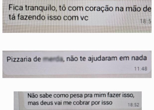 “Não sabe como pesa pra mim fazer isso, mas Deus vai me cobrar por isso. Fica tranquilo, estou com o coração na mão de estar fazendo isso com você. Se eu tivesse dinheiro na minha conta, te mandava só para você poder confiar em mim” afirmou trecho das mensagens.