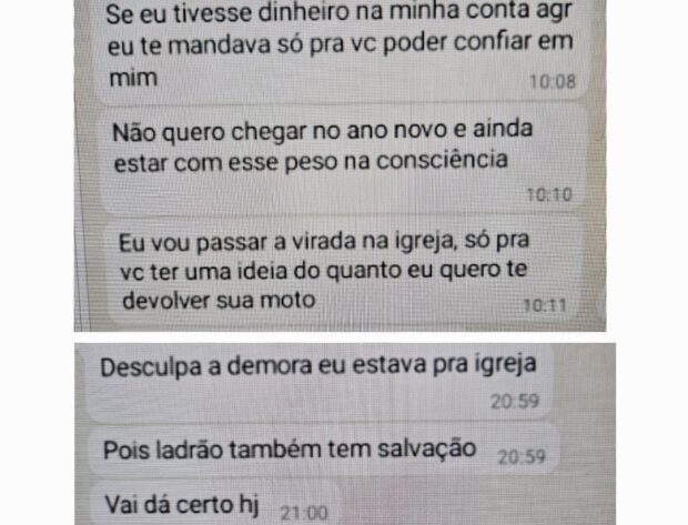 “Não quero chegar no ano novo e ainda estar com esse peso na consciência. Vou passar o Ano Novo na igreja só para você ver o quanto quero devolver a sua moto. Desculpe a demora, estava na igreja pois ladrão também tem salvação”, diz outra parte das mensagens.
