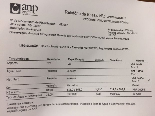 “Três amostras atestam partículas estranhas e mais de 75% de água no combustível. Foi justamente esse alto índice que alterou a temperatura de combustão, causando danos aos aparelhos do laboratório da UFG [Universidade Federal de Goiás]”, explicou. O nível máximo de água tolerado pela agência nacional é de apenas 0,07%.
