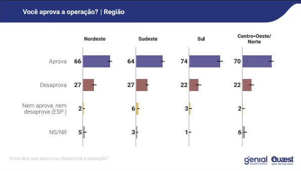 A pesquisa Quaest também revelou que 67% dos brasileiros aprovam a operação no Rio, considerada a mais letal da história fluminense, com 121 mortos, incluindo quatro policiais. Apenas 25% desaprovaram a ação. O levantamento aponta que o tema da segurança pública e as falas do presidente sobre o assunto contribuíram para frear a melhora na percepção do governo federal.