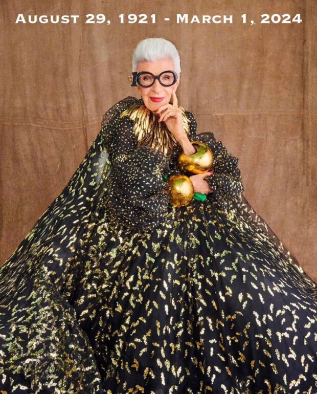 Considerada um dos maiores ícones da moda mundial, Iris Apfel morreu aos 102 anos, nesta sexta-feira, 1. Ela estava em casa (Palm Beach, Flórida), as informações foram divulgadas pelo Instagram, no perfil da estilista, que conta com 3 milhões de seguidores. Não foi compartilhada a causa da morte.