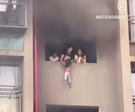 A mãe, que aparentava estar calma, desceu os filhos pela janela, enquanto dois homens que estavam na janela do apartamento abaixo os seguravam. Todos foram salvos sem ferimentos.