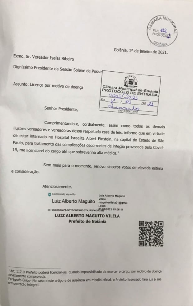 Empossado, o prefeito Maguito Vilela (MDB) segue se recuperando em São Paulo de complicações causadas pela covid-19. Sem previsão de alta, foi encaminhado à Câmara Municipal de Vereadores de Goiânia, um ofício pedindo afastamento do cargo por tempo indeterminado, “até que sobrevenha alta médica”.