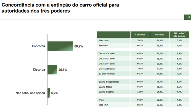 O estudo ouviu eleitores de 16 anos de idade ou mais, entre os dias 21 e 25 de julho de 2019. Os resultados apontaram que apenas 25,6% da população é contra a extinção dos carros oficiais; e 6,2% não sabia ou não opinou.