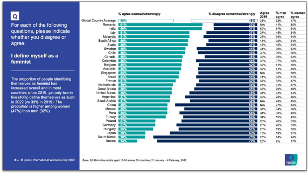 Para chegar nesses números, a Ipsos perguntava aos entrevistados se eles concordavam com a seguinte frase: “Eu me defino como feminista”. A média global foi de 40% que disseram concordar com a frase e 48% discordaram. Dentre a média de todos os países, 47% das mulheres afirmaram ser feministas contra 32% dos homens.