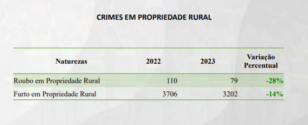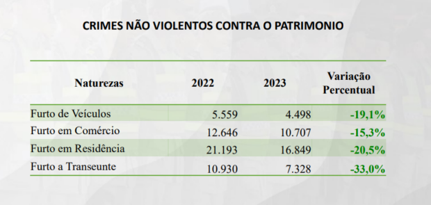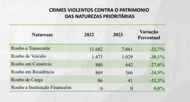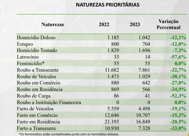Já sobre latrocínio, foram 33 em 2022 e 14 no ano passado, uma redução de 57,6%. Outros crimes violentos também apresentaram queda. Confira: