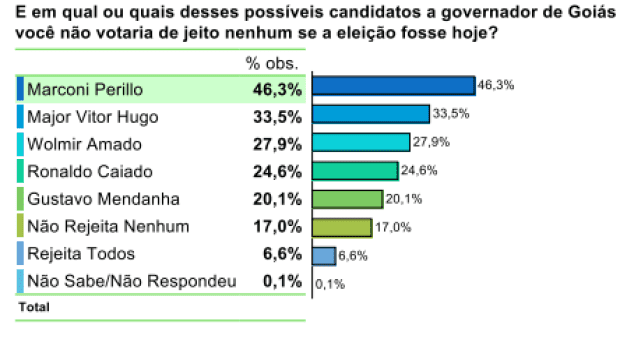 Em segundo lugar, o deputado Major Vitor Hugo (PL), é preterido por 33,5%. O ex-reitor Wolmir Amado (PT) soma 29,7% de rejeição. O liberal e o petista herdam rejeições, respectivamente, do presidente Jair Bolsonaro e do ex-presidente Lula, seus principais apoiadores e que polarizam a disputa pela presidência da República.