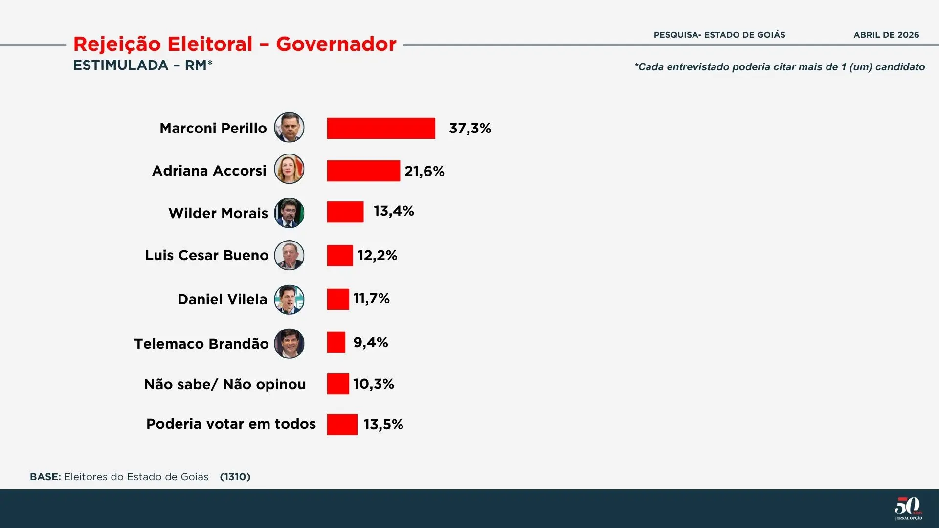 Adriana Accorsi (PT) é o segundo nome mais rejeitado, com 21,6%. Wilder Morais (PL) não apresenta simpatia para 13,4%, Luis César Bueno (PT) conta com 12,2% de rejeição, Daniel Vilela não é a primeira escolha para 11,7% e Telêmaco Brandão não é o nome escolhido para 9,4%.