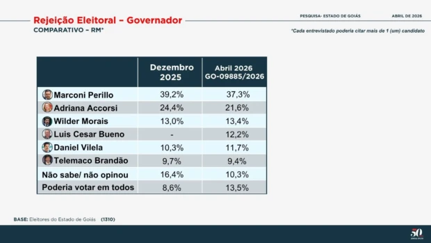 Leia também: Paraná Pesquisas: Daniel Vilela lidera com 43,4% das intenções de voto ao governo de Goiás, Marconi Perillo tem 24,4% e Wilder Morais aparece com 11,5%