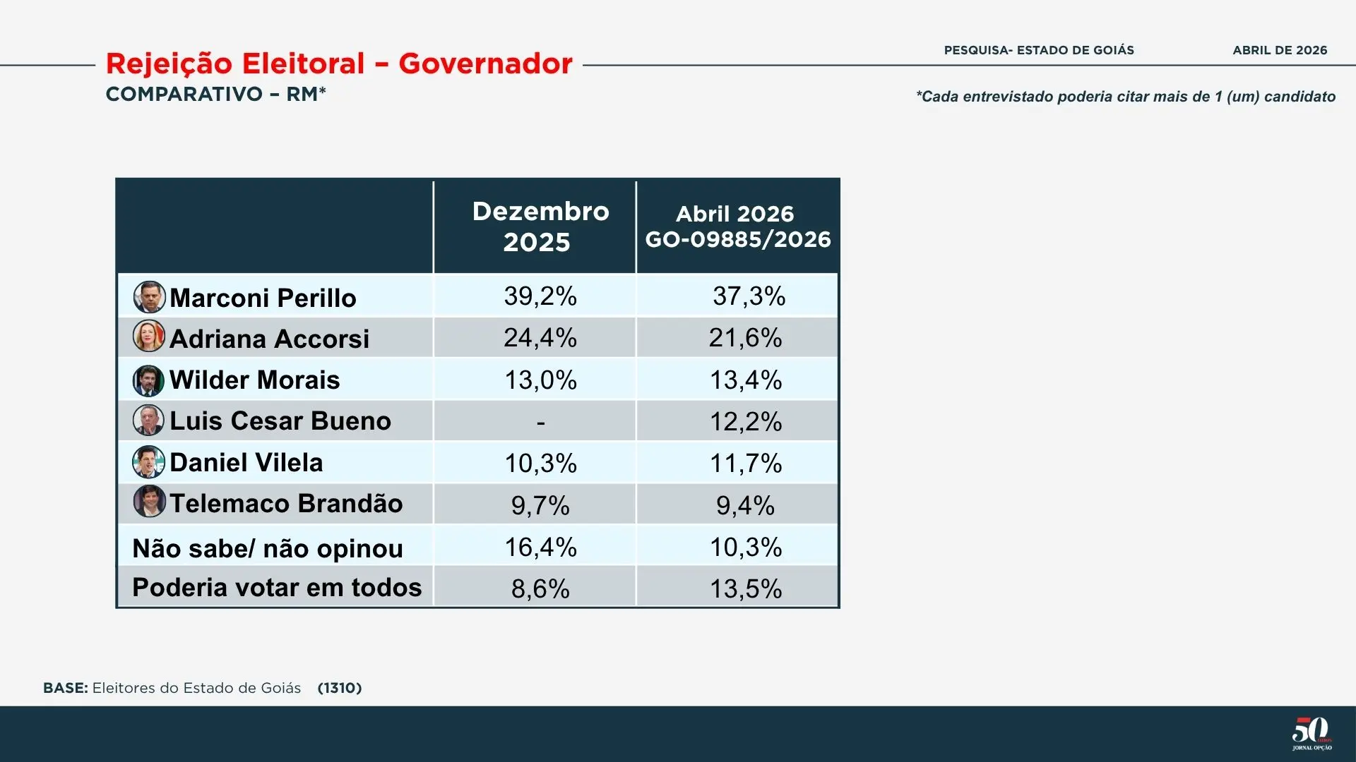 A pesquisa traz uma comparação com o resultado obtido em dezembro do ano passado. Marconi Perillo também era o mais rejeitado à época, com 39,2%; Adriana Accorsi registrava 24,4%, Wilder Morais tinha 13,%, Daniel Vilela apresentava 10,3% e Telêmaco Brandão enfrentava a rejeição de 9,7%. O nome de Luis Cesar Bueno não tinha sido utilizado na pesquisa em questão.
