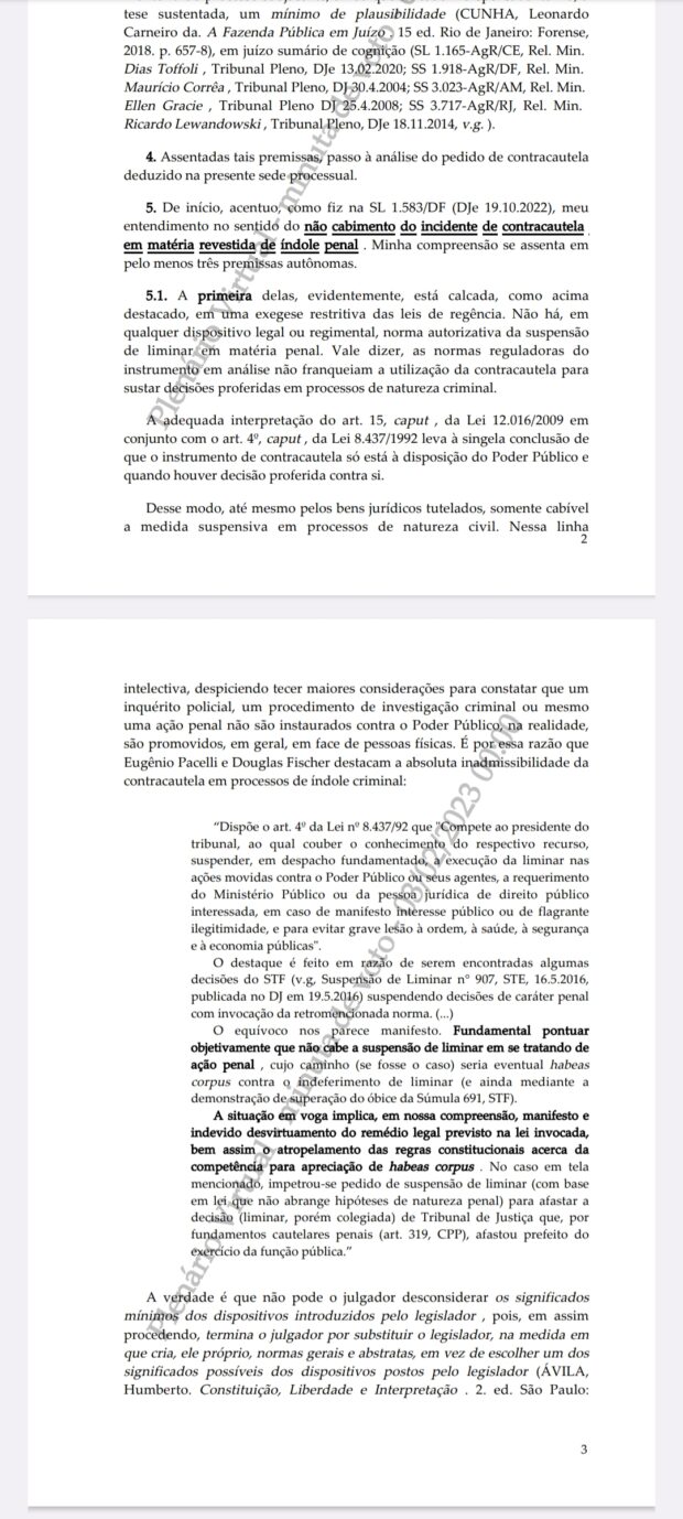 Logo de início, no documento emitido pelo STF após a realização de um julgamento virtual, a ministra ressalta não ter cabimento o pedido de suspensão da liminar, por parte do Ministério Público, em um caso da esfera penal ou criminal.