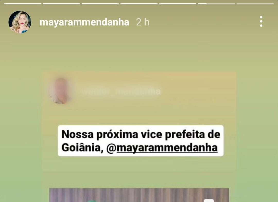 Apesar de afirmar que não existe “qualquer acordo ou definição” para ser vice na chapa do pré-candidato Sandro Mabel para a Prefeitura de Goiânia, a ex-primeira-dama e ex-secretária de Assistência Social de Aparecida, Mayara Mendanha, dá pistas de que há conversas em andamento e interesse na posição. Nos stories de seu perfil no Instagram, Mayara chegou a compartilhar uma postagem na qual o autor se refere a ela como “próxima vice-prefeita de Goiânia”.