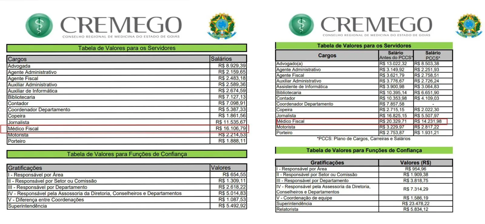 A implantação do Plano de Carreiras, Cargos e Salários (PCCS) do Conselho Regional de Medicina de Goiás resultou em redução da remuneração paga a médicos que atuam como servidores da própria autarquia. Os valores atualmente pagos são inferiores aos praticados antes da mudança no plano.
