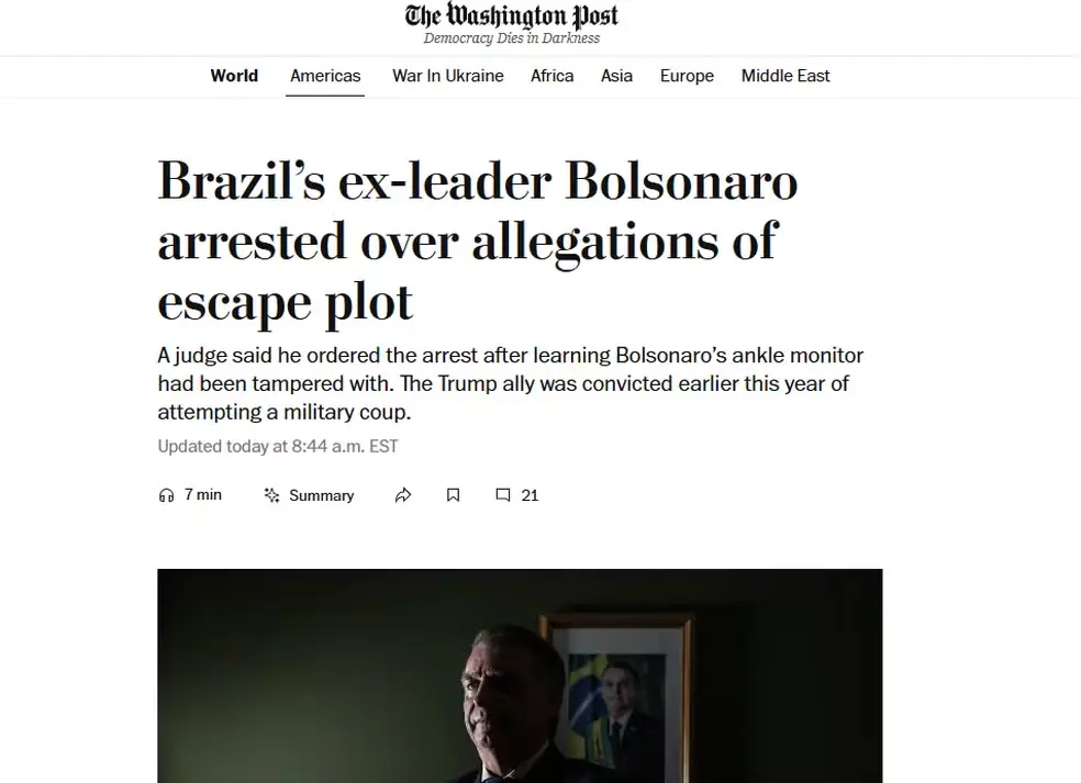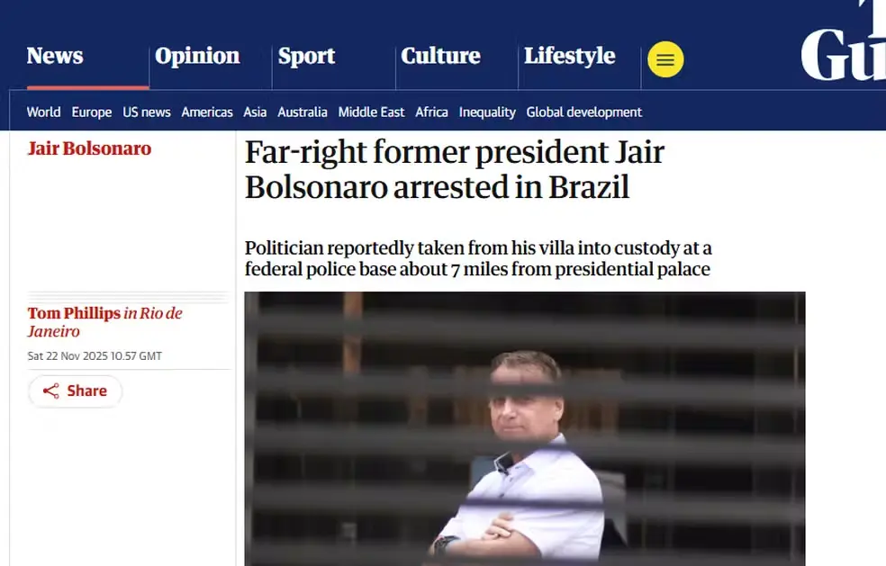 O The Guardian, do Reino Unido, enfatizou que a ordem de prisão se baseia em indícios de violação da tornozeleira eletrônica e risco de fuga, segundo o STF. O jornal também destacou a reação de aliados do ex-presidente, que classificaram a decisão como “perseguição política”.