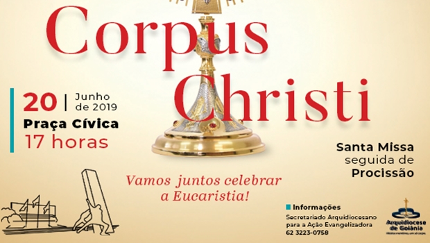 A Arquidiocese de Goiânia realiza nesta quinta, 20, a Missa de Corpus Christi. O evento será realizado na Praça Cívica, com início às 17h. Por volta das 19h, os participantes seguirão em procissão pelo anel interno da praça.