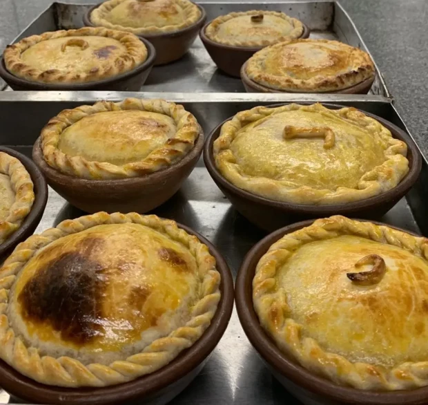 De origem colonial, o empadão goiano é uma espécie de torta salgada de massa firme e recheio farto, marcado por ingredientes típicos do Cerrado, como o pequi e a guariroba, que é um palmito de sabor levemente amargo e característico da região.