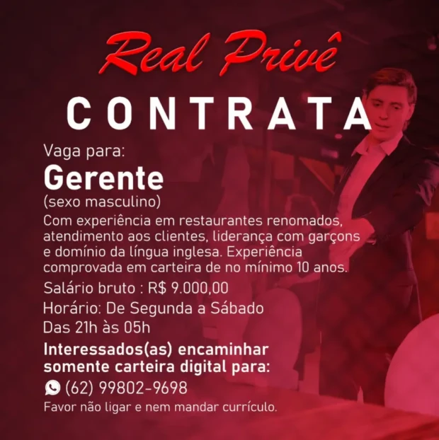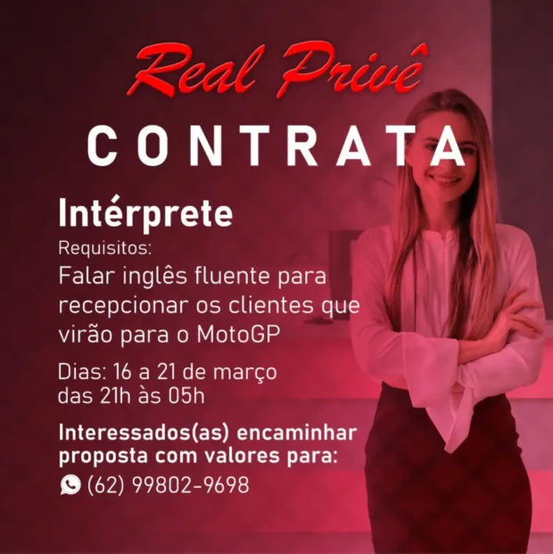 O MotoGP em Goiânia, marcado para março no Autódromo Internacional Ayrton Senna, já começa a movimentar não apenas hotéis e restaurantes, mas também o setor de entretenimento adulto na capital. De olho na chegada de turistas estrangeiros, a casa Real Privê anunciou a contratação de intérprete com inglês fluente e informou que, entre os dias 10 e 21 de março, o atendimento será realizado exclusivamente mediante reserva antecipada.